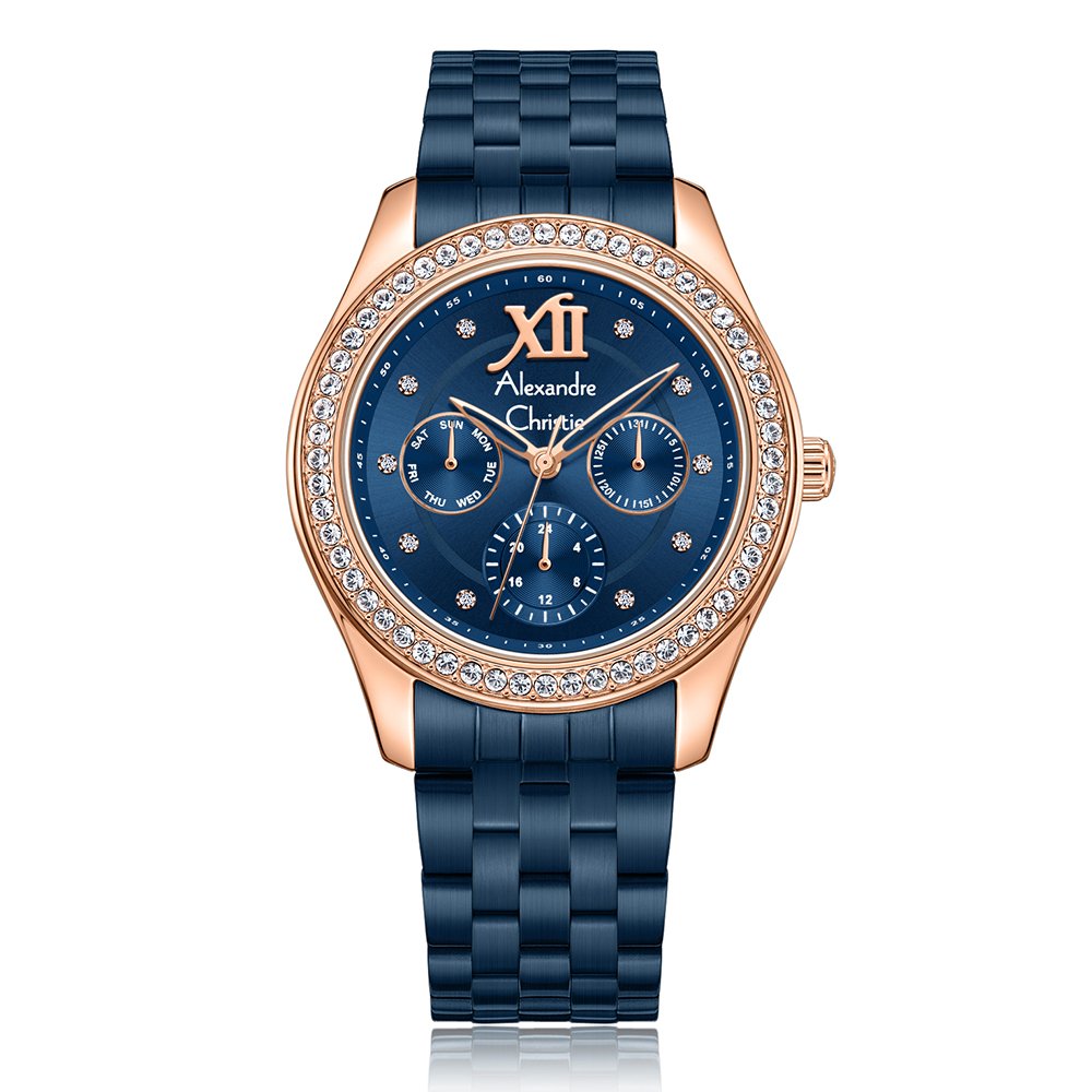 Elegant and functional, the Alexandre Christie 2496 BFB features a crystal-studded bezel, multifunction dial, and stylish metal strap—perfect for both everyday wear and special occasions.